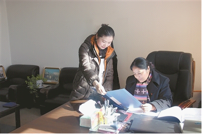 图为强巴白珍(右)与同事研究信访工作重点任务,制定工作计划。吴养辉 摄